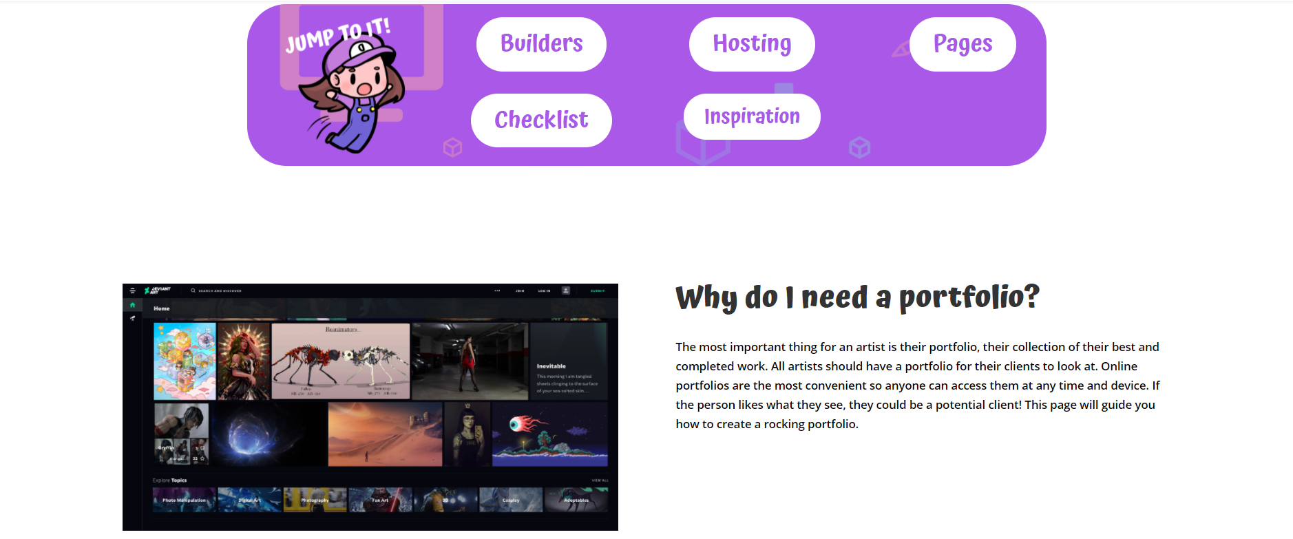 -Portfolio Page with tips on how to build a quality online portfolio with resources like website builders.